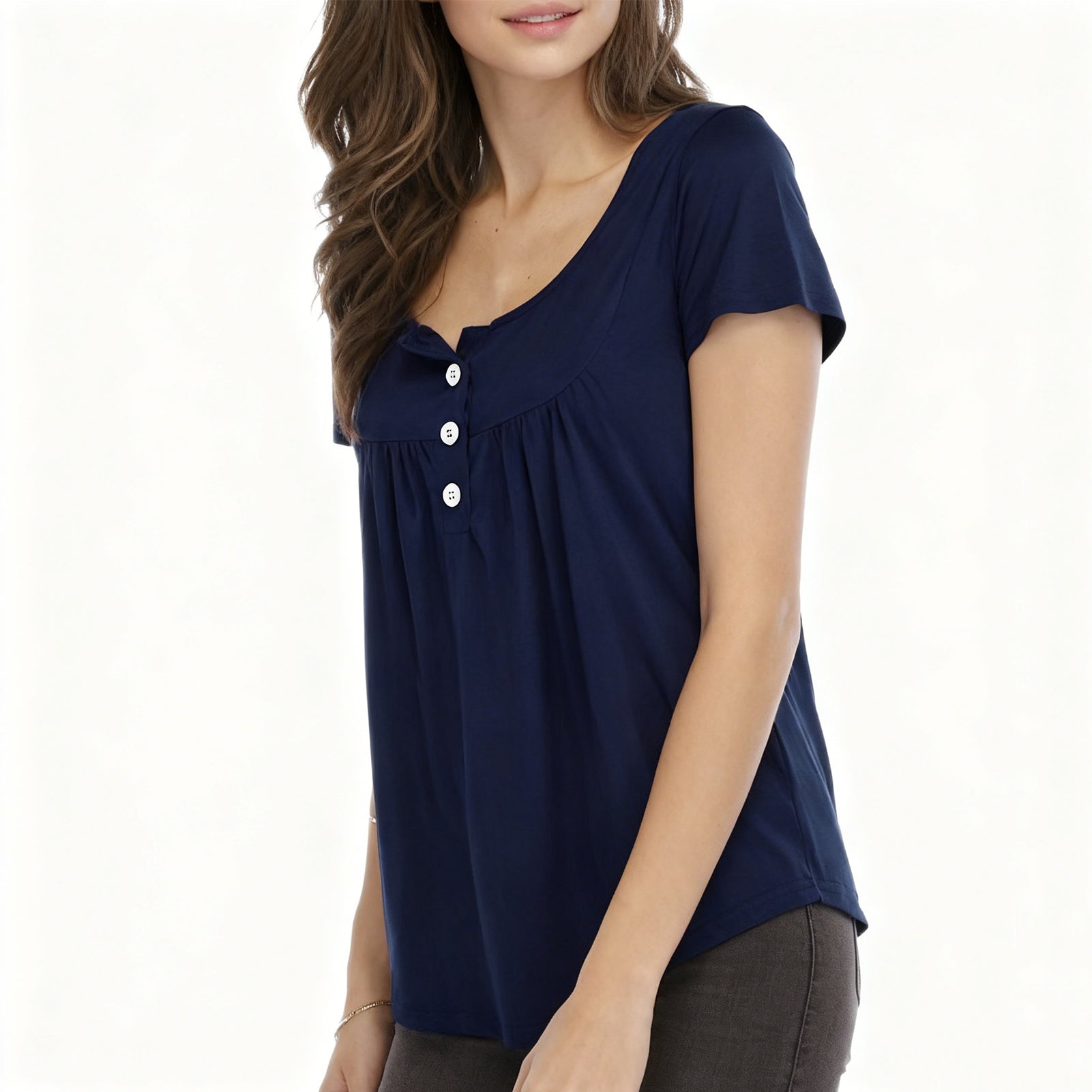 CQZY FUTURE Women's Summer Tops Short Sleeve Henley Top Casual Square Neck Button Down Pleated Blouse with Flowy Fit