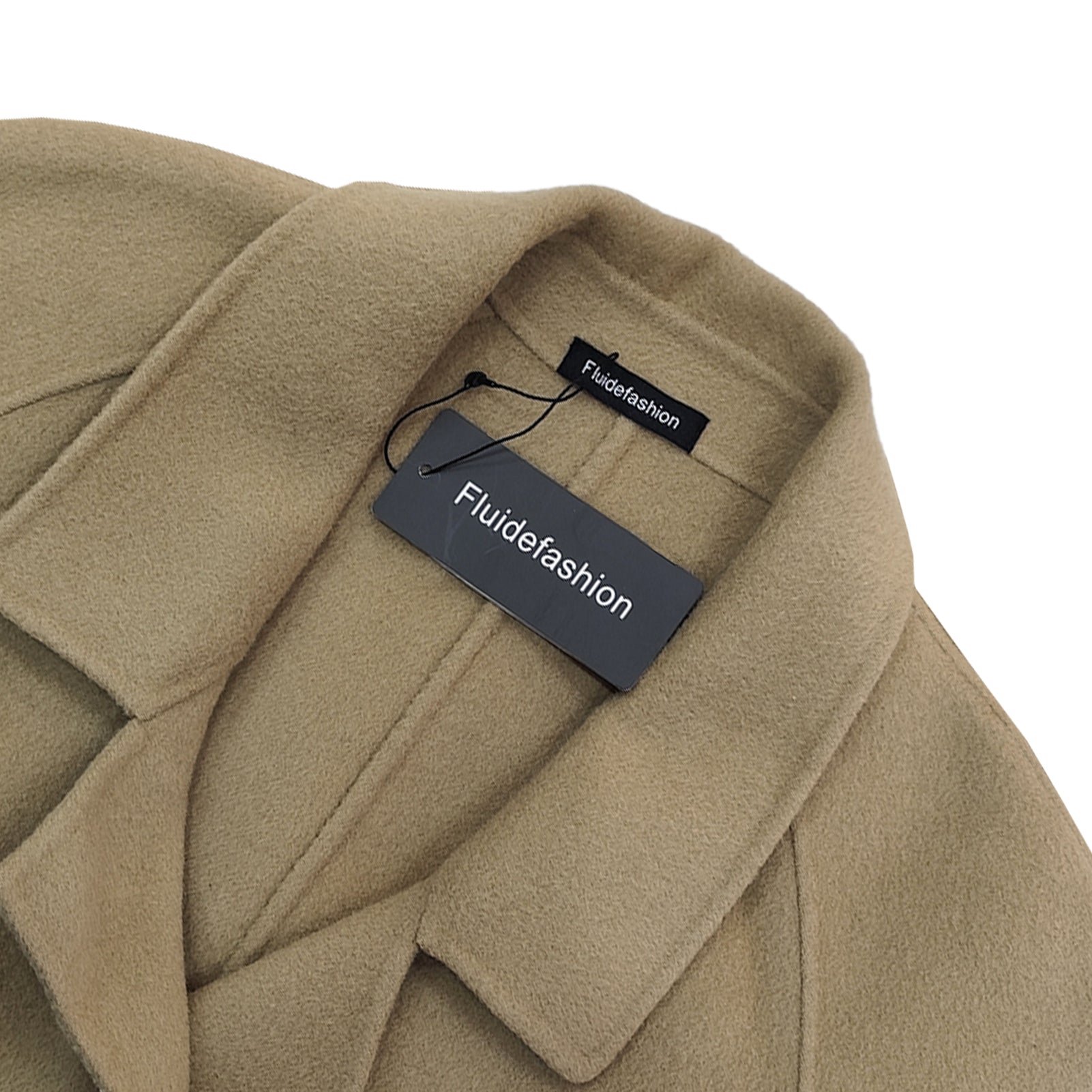 Fluidefashion Women's Long Wool Coat Lapel Collar Double-Breasted Pea Coat Winter Warm Overcoat With Self Belt